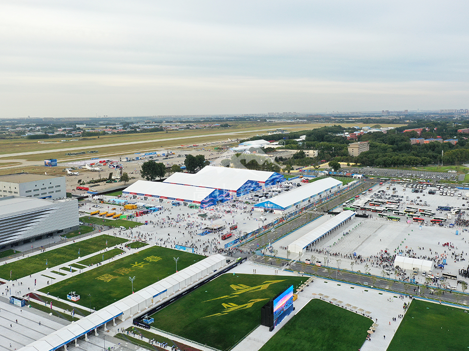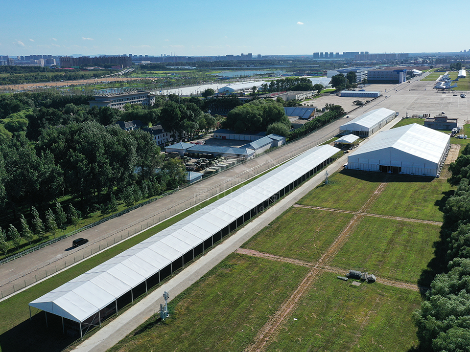高山篷房憑借高強度鋁合金型材和阻燃雙面PVC篷布,為航展提供抗風、防水、防火、防紫外線的優良性能。